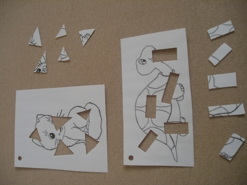 s jednoduchým dětským motivem, který rozstříháme do různých tvarů – čtverců, obdélníků, trojúhelníků, náhodných tvarů. Děti skládají obrázek