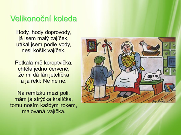 PONDĚLÍ VELIKONOČNÍ: Tento den je věnován tradičním oslavám a zvykům, které vítají příchod jara. Kluci chodí s pomlázkami vyšlehat děvčata a ty jim za odměnu dají malovaná vajíčka nebo kraslice.