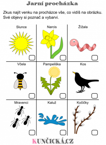 Vyjděte si na zahradu nebo na jarní procházku a pozorujte probouzející se přírodu. Venku si povídejte jak vypadá jaro, co všechno se v těchto dnech mění. Dívejte se
