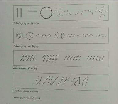 Děti 3- 4,5 let: procvičujeme svislé čáry, vodorovné čáry kreslené zleva doprava, kreslení teček, oblouky, šikmé čáry vedené pomocí opěrných bodů, kruh